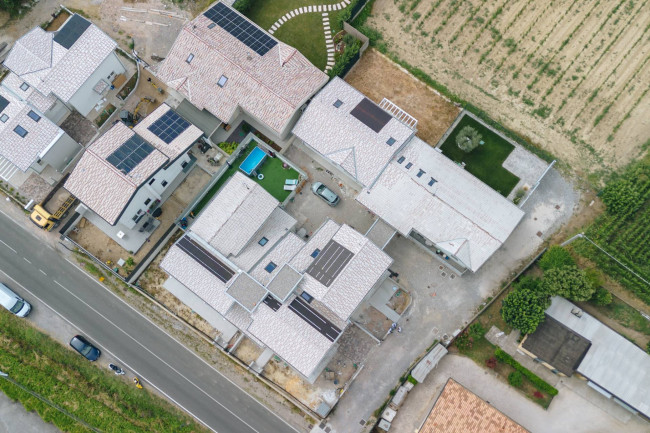 Die Wohnung wird mit innovativen, hochwertigen Systemen ausgestattet sein. Das unabhängige Heizsystem nutzt eine Wärmepumpe und gewährleistet so Energieeffizienz und Wohnkomfort in einem kompakten und eleganten Design. Für angenehme Kühle im Sommer sorgen Split-Klimaanlagen im Innenbereich. Die Fenster und Türen bestehen aus PVC für optimale Wärme- und Schalldämmung, während elektrische, verdunkelnde Rollläden zusätzlichen Komfort bieten. Die Garagentore sind automatisch und sektional. Jede Wohnung verfügt über eine Video-Gegensprechanlage, zentrales Satellitenfernsehen und Telefon – für ein modernes und umfassendes Wohnerlebnis.