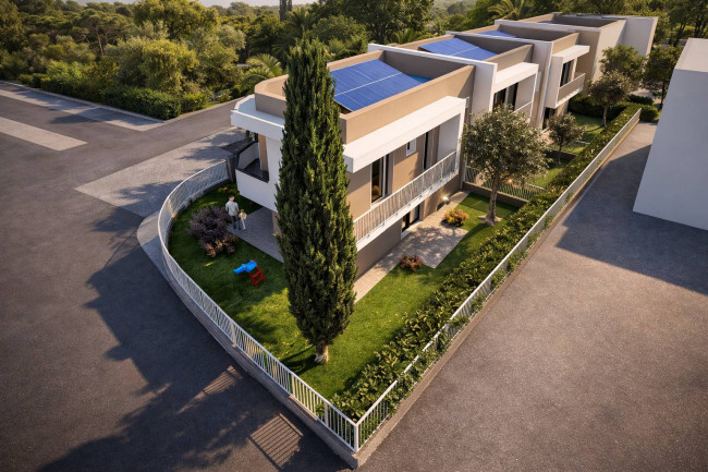 Die Gebäudetechnik ist auf dem neuesten Stand: Jede Einheit verfügt über eine Photovoltaikanlage mit mindestens 3 kW, eine Fußbodenheizung mit unabhängiger Wärmepumpe und eine Möglichkeit zur unabhängigen Klimaanlage. Sicherheit und Energieeffizienz werden durch eine verstärkte Eingangstür und PVC-Fenster mit Drehkippfunktion, Moskitonetzen und motorisierten Aluminium-Rollläden zusätzlich gewährleistet.