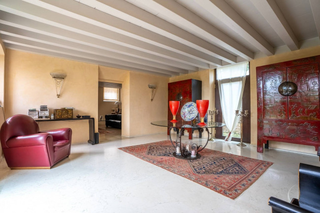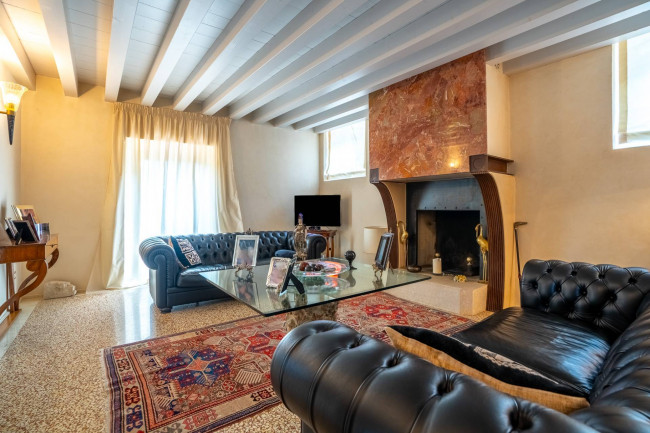 The main entrance leads directly to the ground floor, where the entire living area unfolds. This spacious and harmonious space is characterized by exposed white beams that lend elegance and brightness to every space. The living room, adorned with a designer fireplace perfectly integrated with the home's architecture, is located here; the eat-in kitchen with direct access to the outdoor courtyard; and a bright dining room, surrounded by large windows that flood the space with natural light, is perfect for hosting guests and enjoying convivial moments in a refined atmosphere. A convenient storage room and a bathroom with an anteroom, finished with quality materials, complete the ground floor.