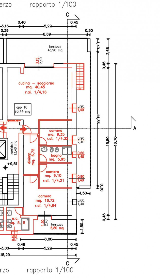 The apartment is spread over two levels, the third floor having a terrace on the upper level, and is also easily accessible by elevator. The entrance leads to the bright living area with an open-plan kitchen and living room, both overlooking the large, approximately 45 square meter terrace that extends on two sides. The sleeping area includes a hallway, two single bedrooms, a bathroom with window, and a master bedroom with a private bathroom and private terrace.