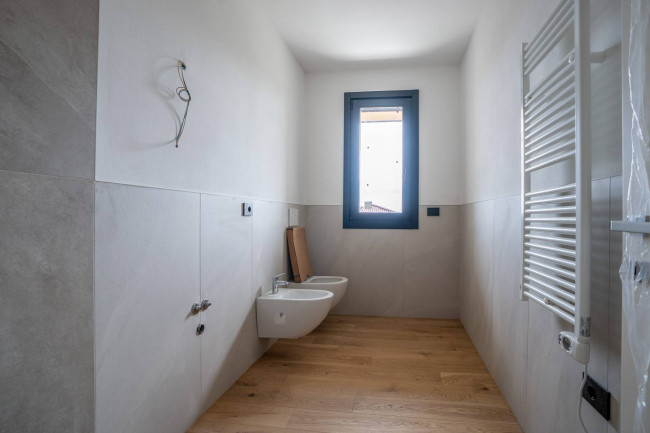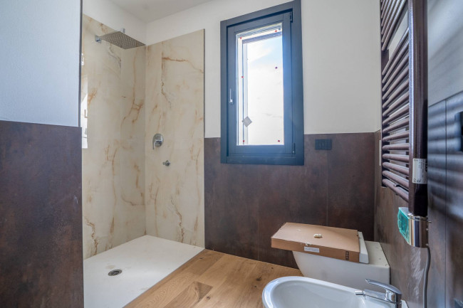 The entire project was constructed using cutting-edge construction technologies, designed to ensure high standards of comfort, energy efficiency, and thermal and acoustic insulation. The finishes were carefully selected: wooden exterior windows, a security door, and an independent heating and cooling system powered by a heat pump. Underfloor heating is present in every room, including the bathrooms, where a heated towel rail has also been installed.