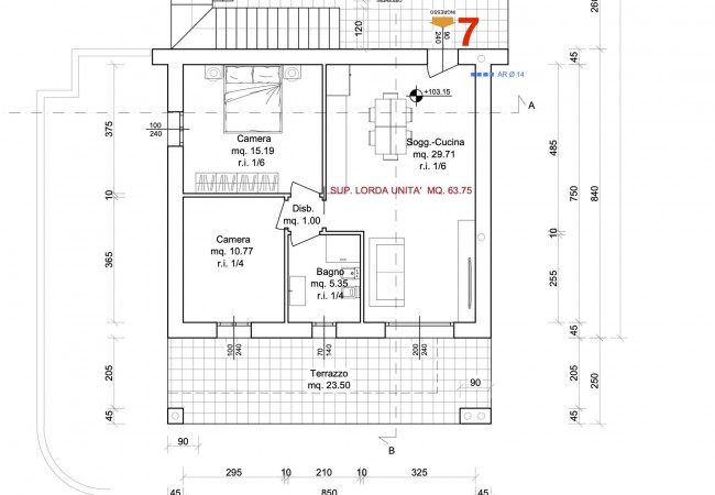 L'immobile si sviluppa su un unico livello così composto: ingresso da terrazzo comune, soggiorno con cucina a vista, disimpegno, camera matrimoniale, camera singola e bagno finestrato.