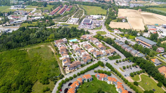 L'immobile si trova all'interno del rinomato residence con piscina "Quadrivium", ed è così composto: ingresso indipendente che conduce al portico coperto, zona giorno composta da un luminoso soggiorno e da una cucina separata. La zona notte è ben distribuita grazie a un comodo disimpegno che accompagna al bagno finestrato e alle due camere matrimoniali, entrambe dotate di accesso diretto al plateatico coperto, ideale per momenti di relax all'aperto.